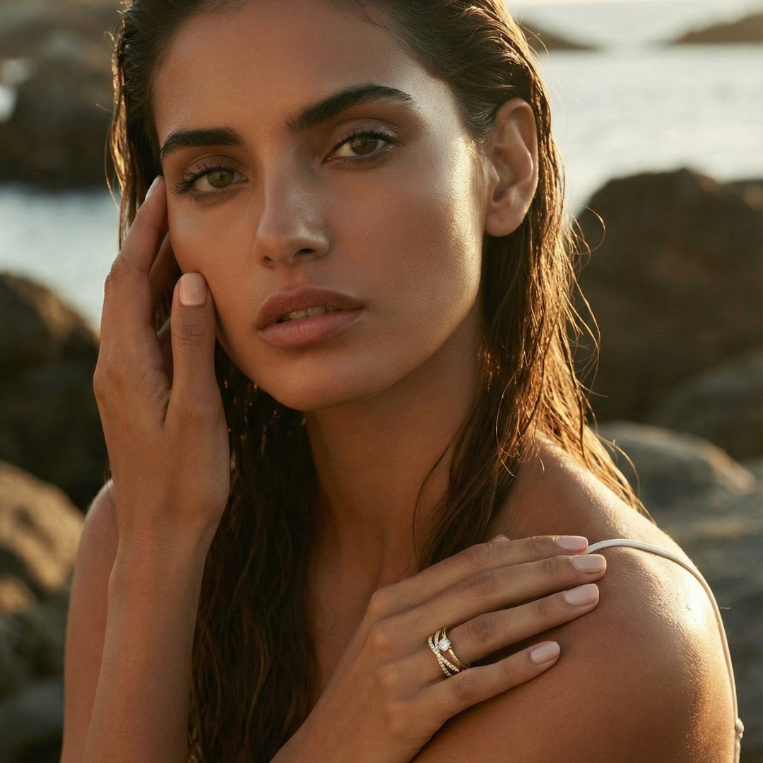 Bien plus qu'un simple ornement, la bague est une touche de lumière qui vient magnifier la gestuelle. Elle attire le regard sur la finesse des mains, soulignant chaque mouvement avec élégance et grâce.